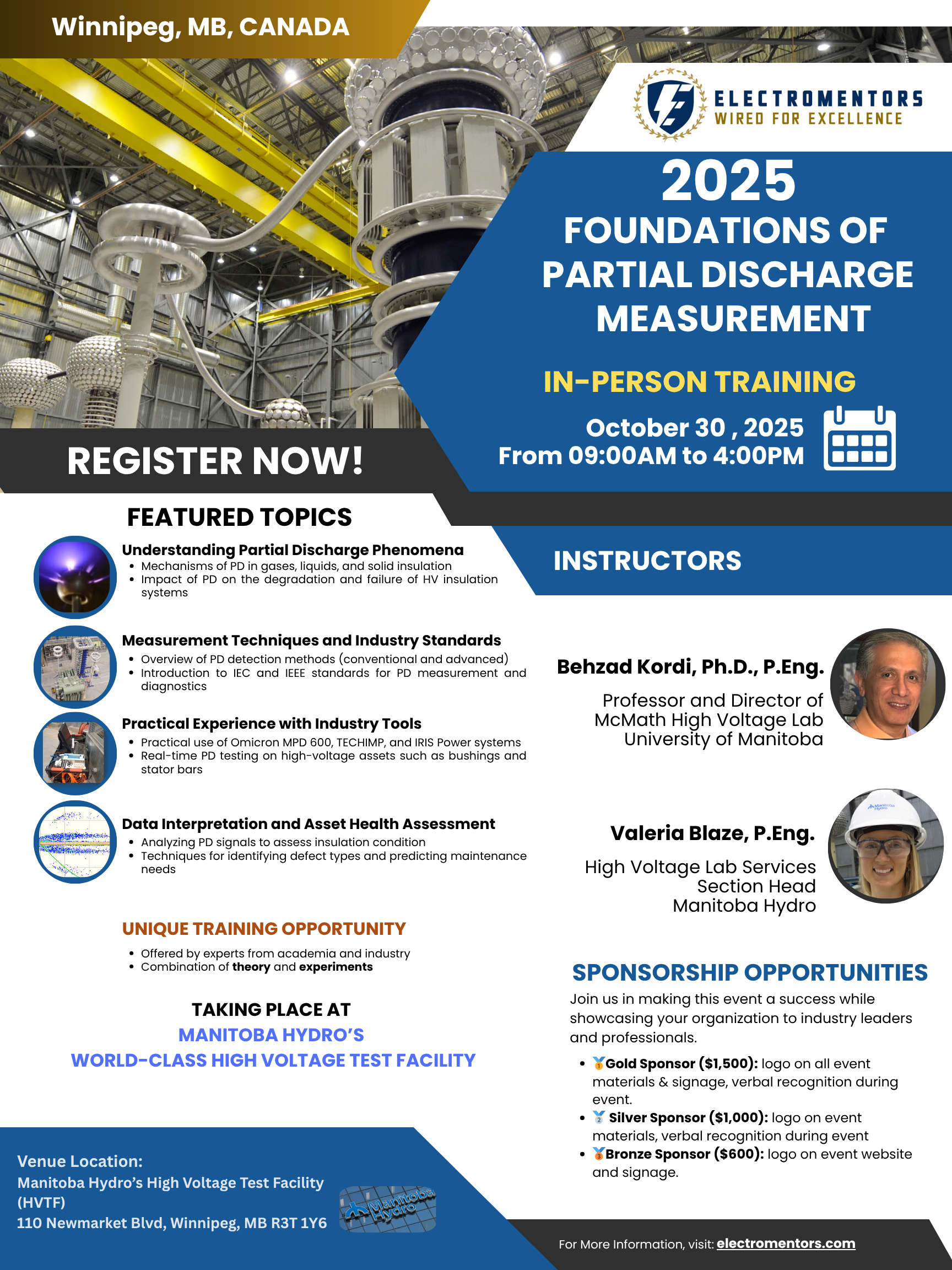 ElectroMentors is pleased to announce the 2025 Foundations of Partial Discharge Measurement Bootcamp, hosted at Manitoba Hydro’s world-class High Voltage Test Facility (HVTF) — a leading utility in high-voltage engineering and partial discharge diagnostics. This full-day, in-person training covers the core principles of partial discharge (PD) measurement and its critical role in assessing the health and reliability of high-voltage insulation systems. The program blends theory with live demonstration sessions, giving participants valuable insights into PD measurement, interpretation, and asset health assessment.