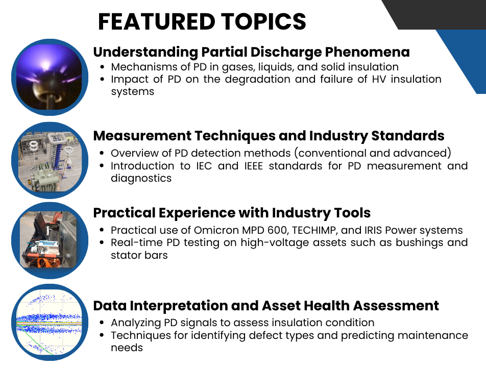 From exploring the physics of partial discharge to observing advanced PD diagnostic tools in operation on real high-voltage assets, this bootcamp delivers an unmatched combination of academic insight and real-world applications. Attendees will see live demonstrations with industry-leading equipment and learn proven techniques to diagnose insulation issues before they become costly failures.